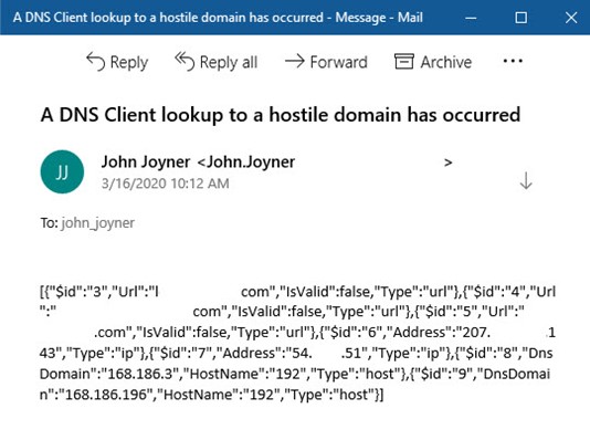 The resulting email alert when the DNS Client Lookup to a Hostile Domain occurs can be seen in Figure 10.