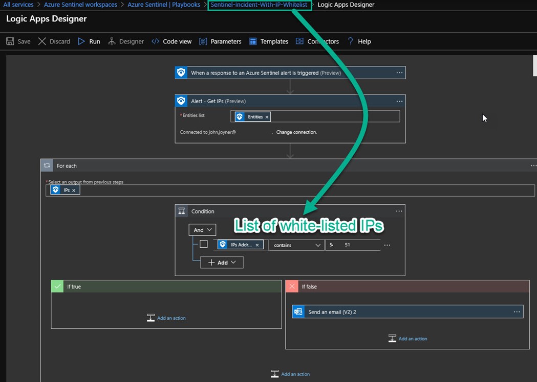Figure 11 shows the completed Logic App (playbook). Once this playbook is specified as the automated response to any Azure Sentinel incident, if the IP entity field contains the whitelisted IP address, no further actions are taken. The Azure Sentinel Incident still appears in the portal, but no actions occur other than creating the incident.