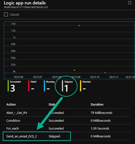 You will notice you don’t receive an email or other normal alerting action when the white-listed domain is encountered. To verify your action override is working properly, navigate to Azure Sentinel -> Playbooks and open the playbook of interest. On the Overview page, at the bottom is the Runs history. Select the run you want to verify and push the Run Details button. Observe in Figure 12 that the Send an email step was skipped because the checked condition (if the IP in the alert is whitelisted) was true.
