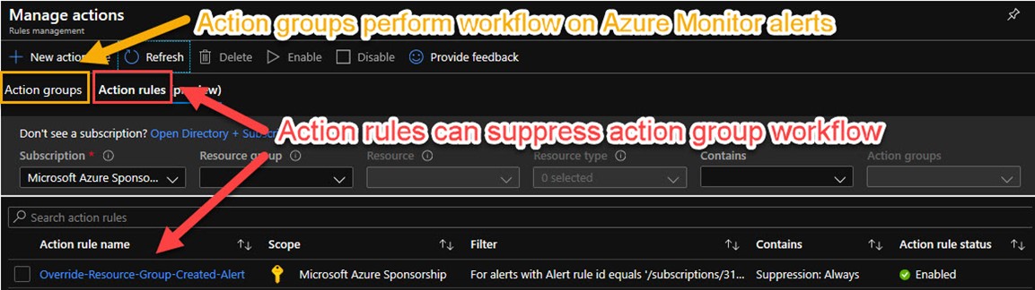 Figure 2 – Azure Monitor rules management: Action groups and Action rules.
