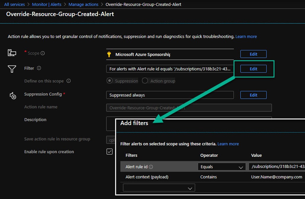 Returning to the example use case (to not alert when a specific user, such as yourself, creates a new Azure resource group), consider that you need some information to create the ‘override’ Action rule. Specifically, you need to know the Alert Rule ID of the Azure Monitor Alert rule you want to override, and a text string from the Alert context (payload) that indicates the presence of the overriding condition. Figure 3 shows how you enter this information when adding filters to the suppression rule.