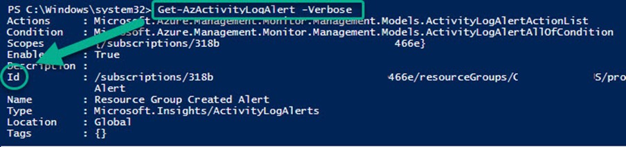 Finding the Alert rule ID depends on the type of alert you are overriding, for example, a log alert, a metric alert, or in this case an activity log alert. You can use the Azure PowerShell command Get-AzActivityLogAlert to find the value of the Id attribute as seen in Figure 4. An Azure Monitor Alert rule ID consists of a long canonical string that includes your Azure subscription, Azure resource group, and Azure Monitor rule name.
