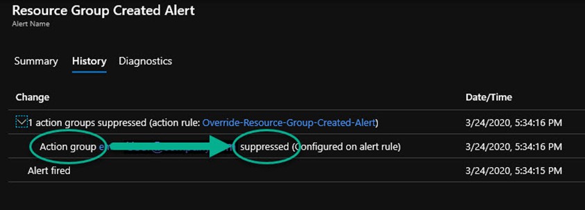 You will notice you don’t receive an email or other normal alerting action. To verify your action override is working properly, locate and select the alert that fired in the Azure Monitor alerts view, and push the History button as shown in Figure 5. Observe the suppression action occurred immediately after the alert fired.