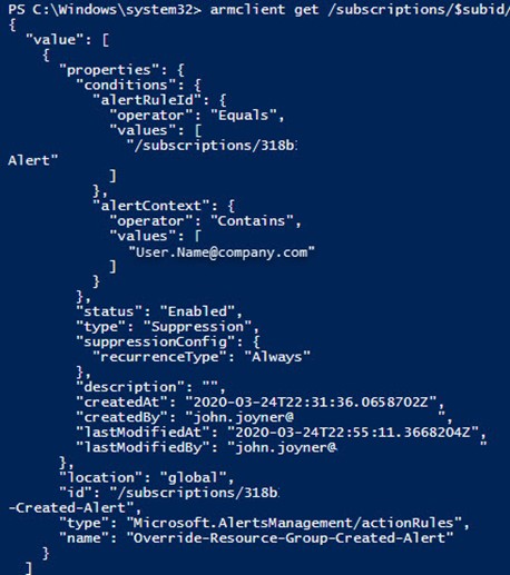armclient get /subscriptions/$subid/resourcegroups/$rsgname/providers/Microsoft.AlertsManagement/actionRules/?api-version=2019-05-05-preview