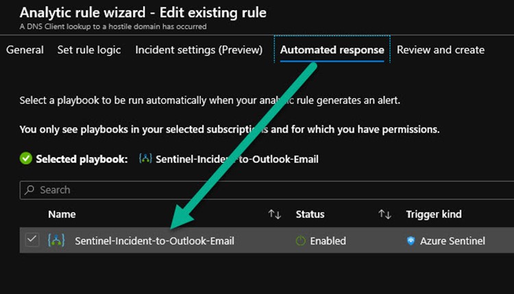 The Azure Sentinel console features a Playbooks space where you can create and manage a collection of Azure Logic Apps that achieve automated and/or on-demand workflow on Sentinel incidents (learn more here). For each Azure Sentinel timed query analytics rule, there is an Automated response page where all the playbooks you have defined are listed. Selecting a playbook (seen in Figure 8) will cause the Logic App to fire automatically when the incident is created.