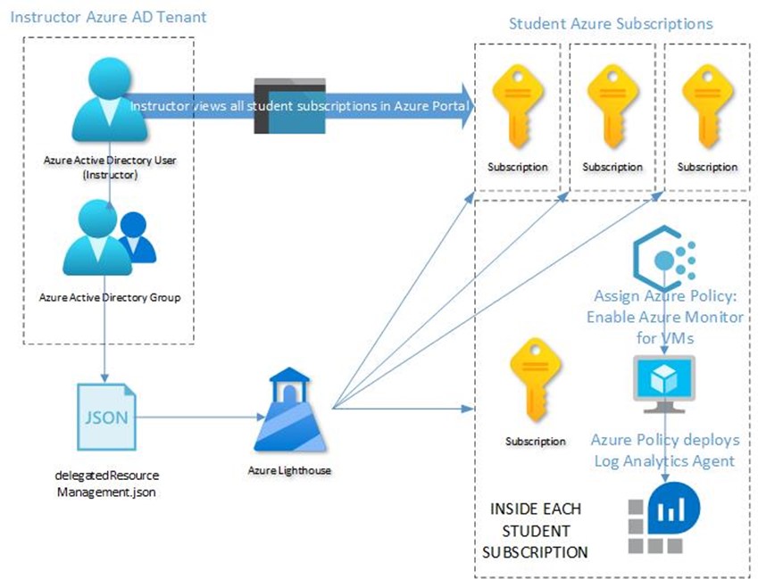 - Then an Azure Lighthouse deployment occurs that maps the Azure AD security group containing the instructor account to security roles in the student subscriptions.