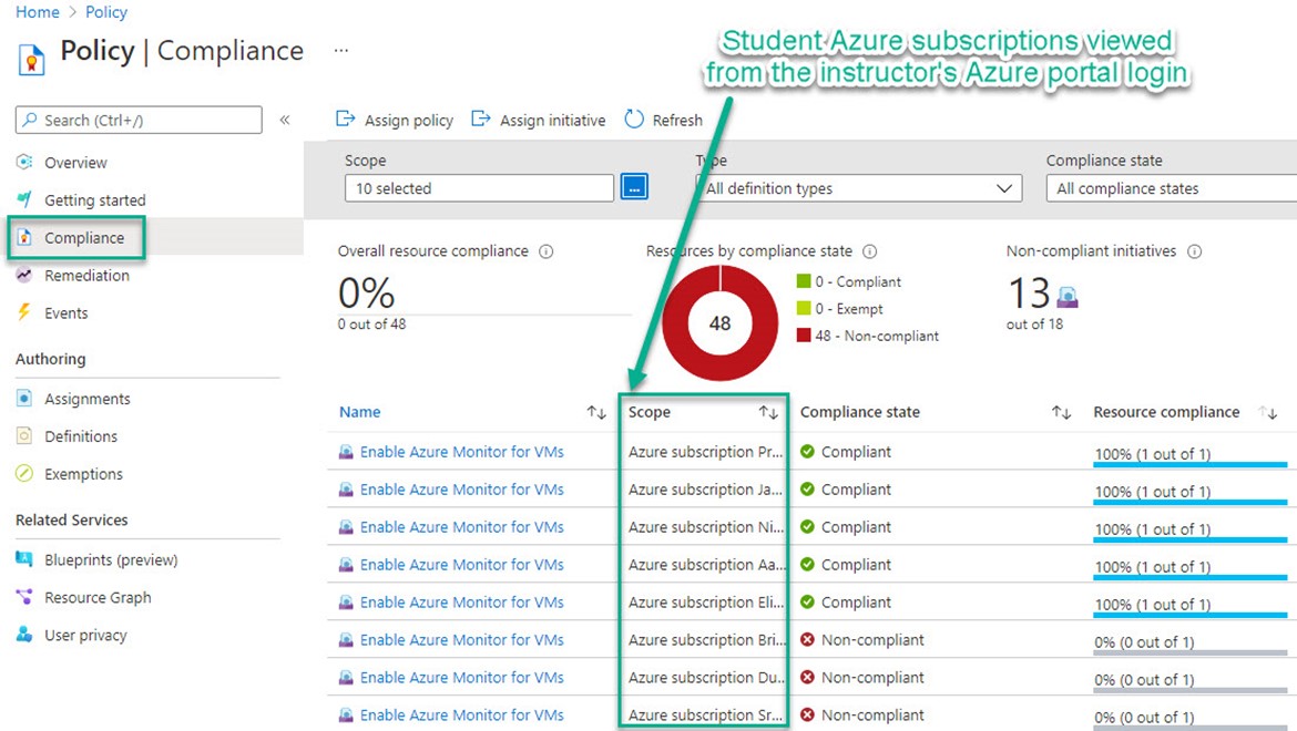 - The instructor can view the resources inside all the student subscriptions at once, such as Azure Policy that enables Azure Monitor for VMs.