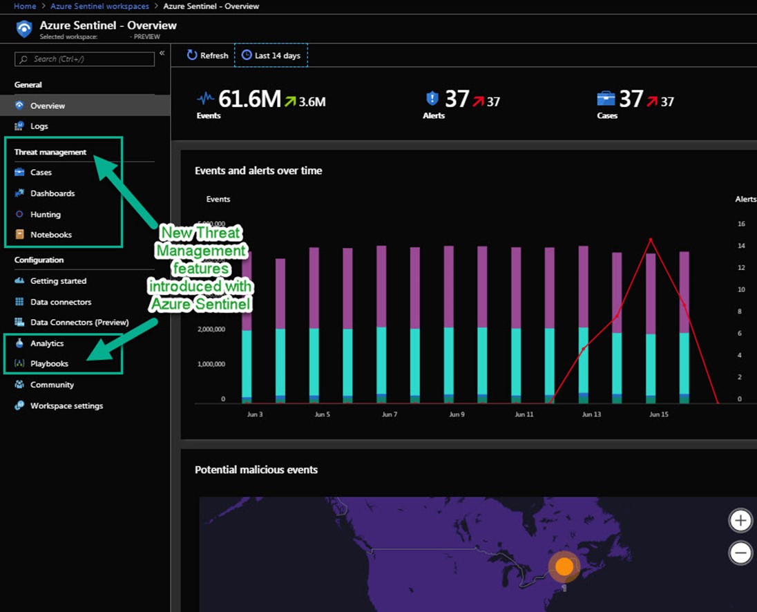 Now it seems Microsoft has been working on, and is now ready to share with the public, the “plus” service they have built on top of what was already in Azure. Azure Sentinel provides a framework that is robust and scalable enough so as to appeal to enterprise customers seeking the best value in cloud-based SIEM services. Running on top of familiar and cloud-proven technologies like Azure Logic Apps, Machine Leaning (ML), and the Kusto query language used by Azure Log Analytics, the “plus” pieces are found in the Threat management menus of the Azure Sentinel Overview page: