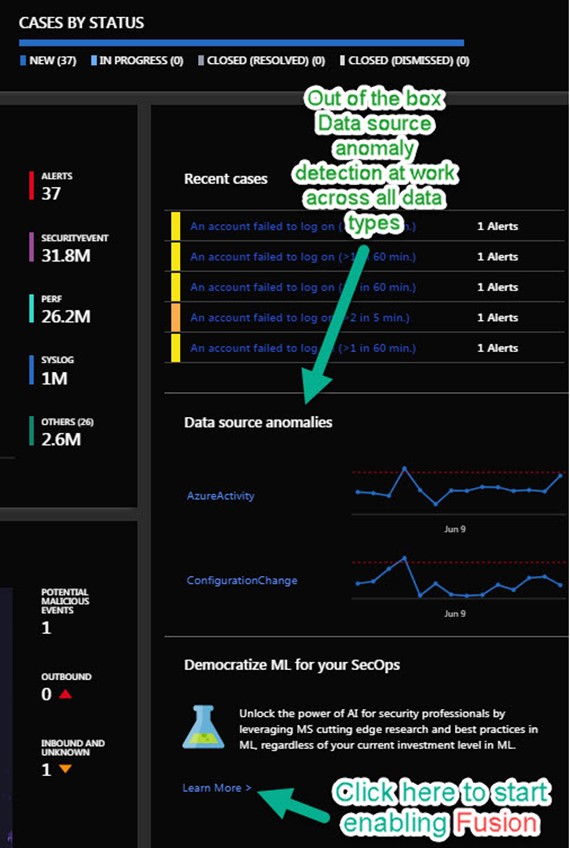 Figure 2 – Overview page of Azure Sentinel (right side): Enable Fusion for more ML features, explore Data source anomalies