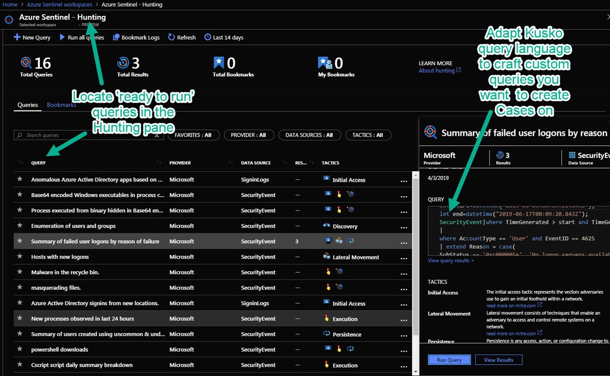 2. Use the Hunting feature of Azure Sentinel Threat management to identify queries that produce results of interest, like “Summary of failed user logins by reason”. (See Figure 3.) The pre-populated queries get you started on creating your own valuable Kusto-based queries customized for your environment.