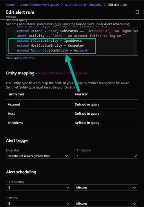 Tip: Be sure to configure the Entity mapping portion of the alert rule (seen in Figure 4), this helps Sentinel recognize the key data elements in the event when performing investigations.
