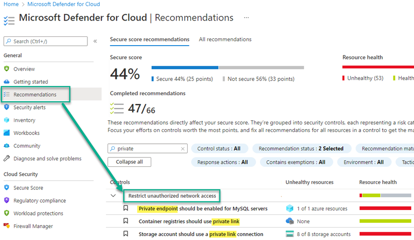 Figure 1 – Microsoft Defender for Cloud recommendations to enable private endpoints.