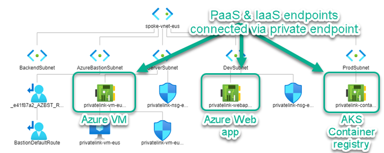 Figure 2 – Private endpoints of PaaS services appear as network interfaces in the VNET map.