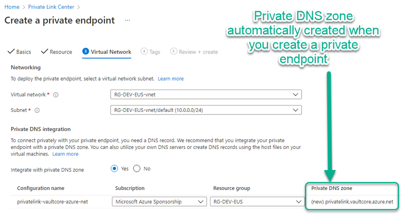 Figure 5 – Creating a private endpoint for an Azure PaaS service automatically creates a Private DNS zone of the correct name.