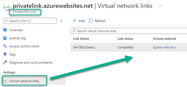 After you create a private DNS zone in Azure, you’ll need to link a virtual network to it. Once linked, computers hosted in that virtual network can access the private DNS zone. Every private DNS zone has a collection of virtual network link child resources, Figure 6 is an example. Each one of these resources represents a connection to a virtual network. A virtual network can be linked to private DNS zone as a registration or as a resolution virtual network. You can create only one link between a private DNS zone and a virtual network.