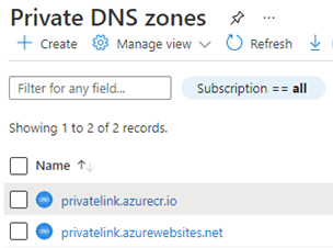 Figure 8 – Private DNS zones for an Azure subscription with container registry and web app private endpoints.