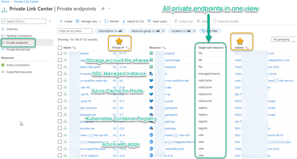 Figure 9 – The Private Link Center in the Azure portal provides a consolidated view of all private endpoints—each resource is assigned a private IP in a VNET and subnet.