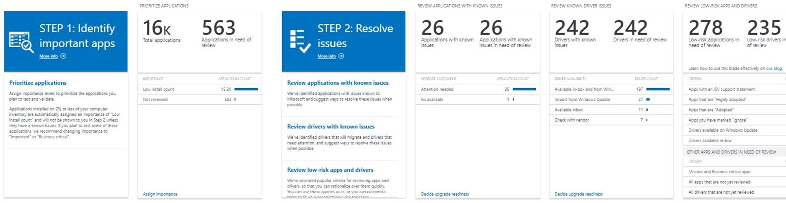 The intelligence in the Upgrade Readiness solution helps you achieve this business goal: Spend your time on issues that impact the largest number of computers. Without this data, you can get bogged down in individual application and driver issues that make project timelines difficult to estimate reliably. With the data, you know the valuable time of your helpdesk team is going to the best use—making the highest number of computers ready to upgrade. The solution helps you identify issues and prioritize work assignments that will clearly achieve your overall upgrade project goals.