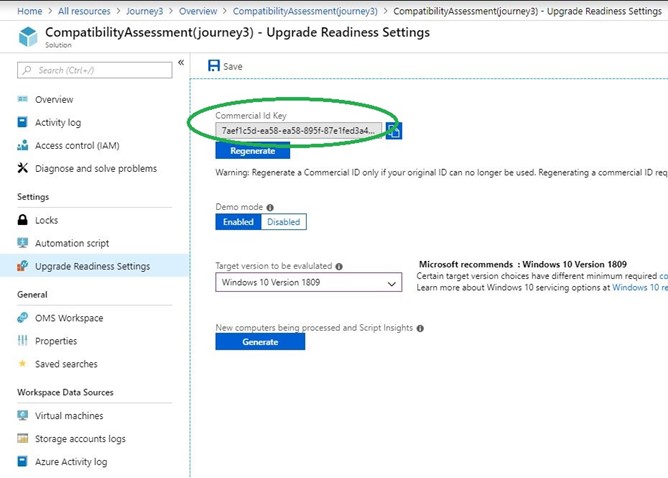 After you add the solution to your Log Analytics workspace, navigate to Solutions -> CompatibilityAssessment -> Upgrade Readiness Settings where you will find your Commercial Id Key as seen in Figure (5). You use this key to configure your client computers in the solution.