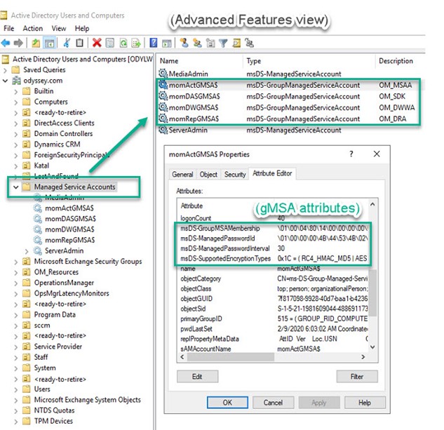 gMSAs are created using the New-ADServiceAccount PowerShell cmdlet, they can’t be created with the AD Users and Computers snap-in. When you create a gMSA, an object of type ms-DS-Group-Managed-Service-Account is created in AD. You can view your gMSAs in AD Users and Computer snap-in with View Advanced Features enabled. Figure 1 shows the four corresponding gMSAs you will create to migrate your SCOM 2019 UR1 instance(s)–From using legacy password-based user accounts to using new gMSA accounts. Observe also the managed password attributes that exist in a gMSA AD object.