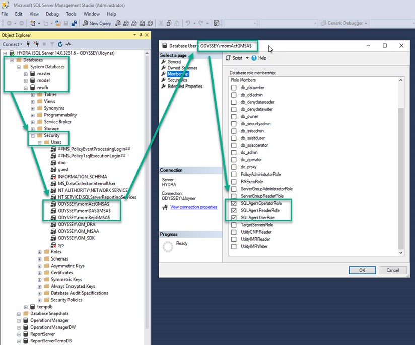This is the most time consuming step and you need to pay attention to detail that you make all the necessary changes correctly. Figure 5 shows where and how you add SQL database permissions for one account in one database (here the momActGMSA$ account’s permissions to the msdb system database):