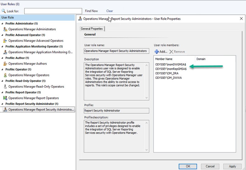 Additionally, and although I didn’t find this step in Microsoft documentation, I found it was necessary to avoid error messages. Add the new Data Warehouse Write Account and Data Reader accounts (momDWGMSA$ and momRepGMSA$) to the Operations Manager Report Security Administrators User Role in the SCOM Console -> Administration -> Security -> User Roles as shown in Figure 6.