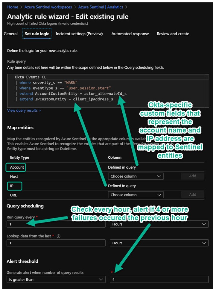Since Okta is an added (third party) data source integration, there is not a convenient pre-configured list of relevant analytics templates to enable as rules (like there was for Azure Active Directory). However, we know that Okta is an SSO service like Azure Active Directory, so we can copy the functionality of relevant built-in Azure Active Directory templates and adapt them to the Okta data source. Figure 10 shows a custom rule for Okta data that alerts when four (4) or more Okta user login failures occur in a one-hour period. [In Okta logs, “WARN” events of the “user.session.start” type indicate user login failure.]