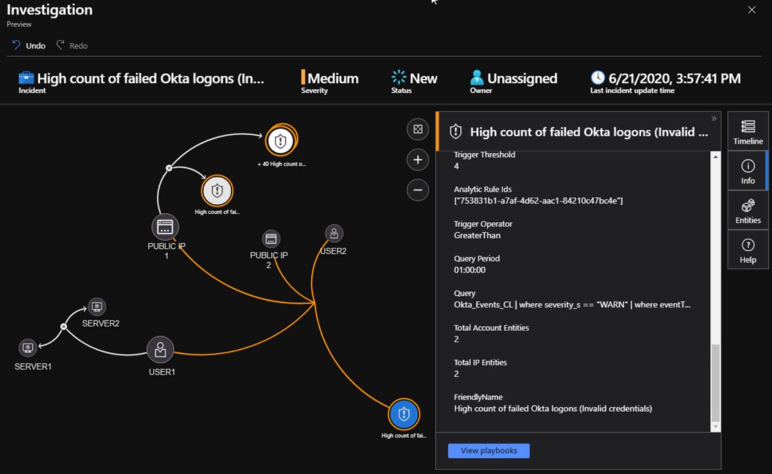 The custom Sentinel alert rule seen above in Figure 10 maps the Okta-specific custom fields “actor_alertnateID_s” and “client_ipAddress_s” to the AccountCustomEntity and IPCustomEntity fields that Azure Sentinel understands. This lets you take advantage of Azure Sentinel’s advanced investigation features to search across incidents for correlation and anomaly detection. Figure 11 shows an incident being investigated where USER1 from PUBLIC IP 1 failed to login to Okta, but the same user account did login successfully to local servers SERVER1 and SERVER2.