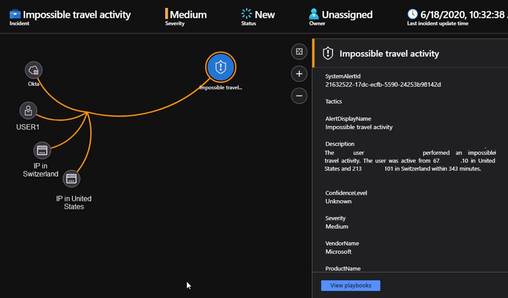 An incident produced by integrating Okta, MCAS, and Azure Sentinel can be seen in Figure 13, an Impossible travel activity detection made by MCAS involving an Okta SSO login. The MCAS incident experience in Azure Sentinel is identical regardless of which SSO provider and/or cloud app is involved.