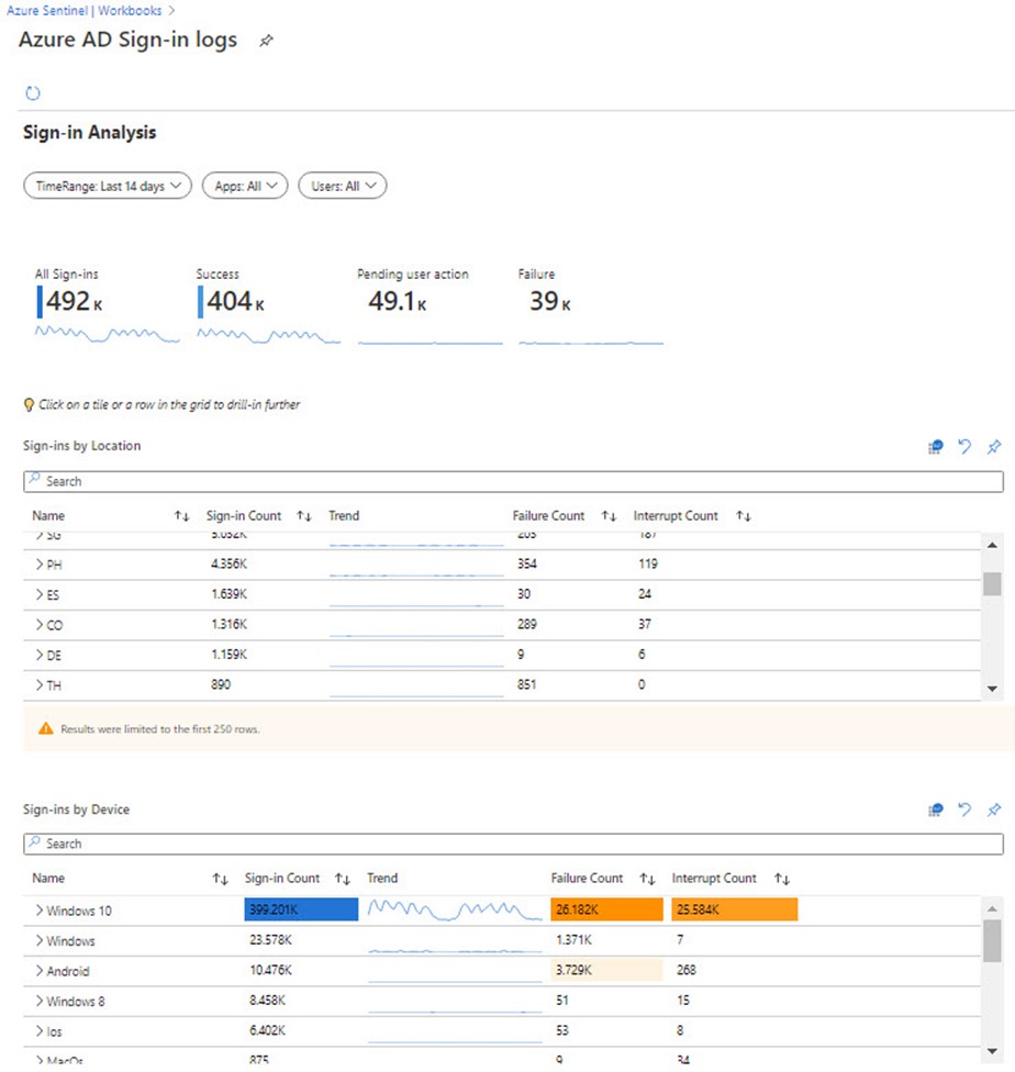 The Azure Active Directory data connector for Azure Sentinel includes four (4) built-in workbooks: Azure AD Sign-in logs (seen in Figure 15), Azure AD Audit logs, Insecure Protocols, and Azure AD Audit, Activity and Sign-in logs.