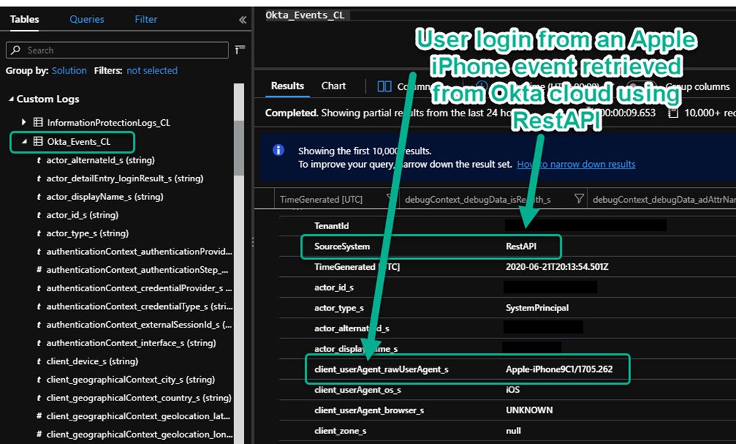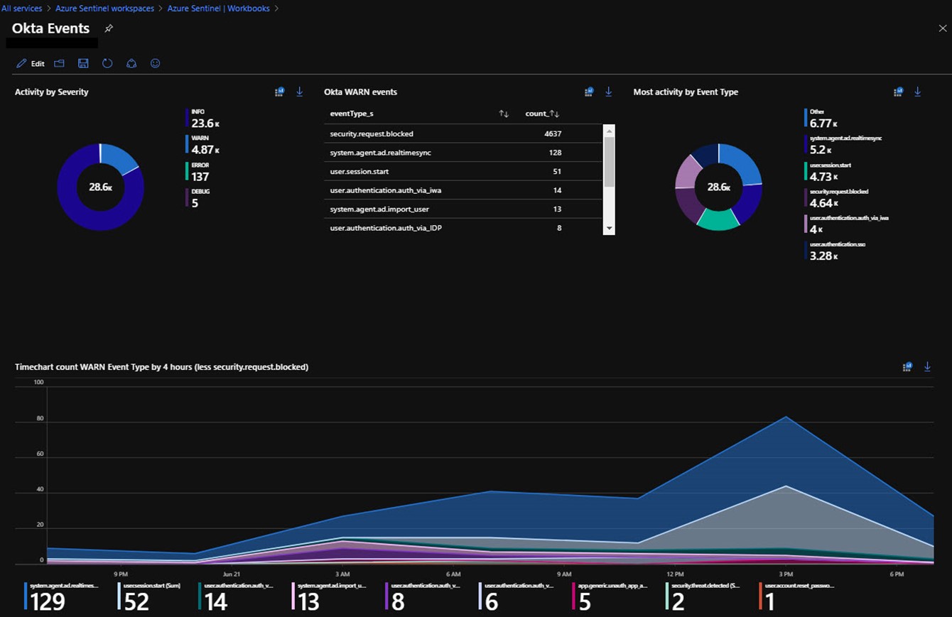Figure 7 – Okta SSO events are transcribed to the Azure Sentinel workspace for analysis.