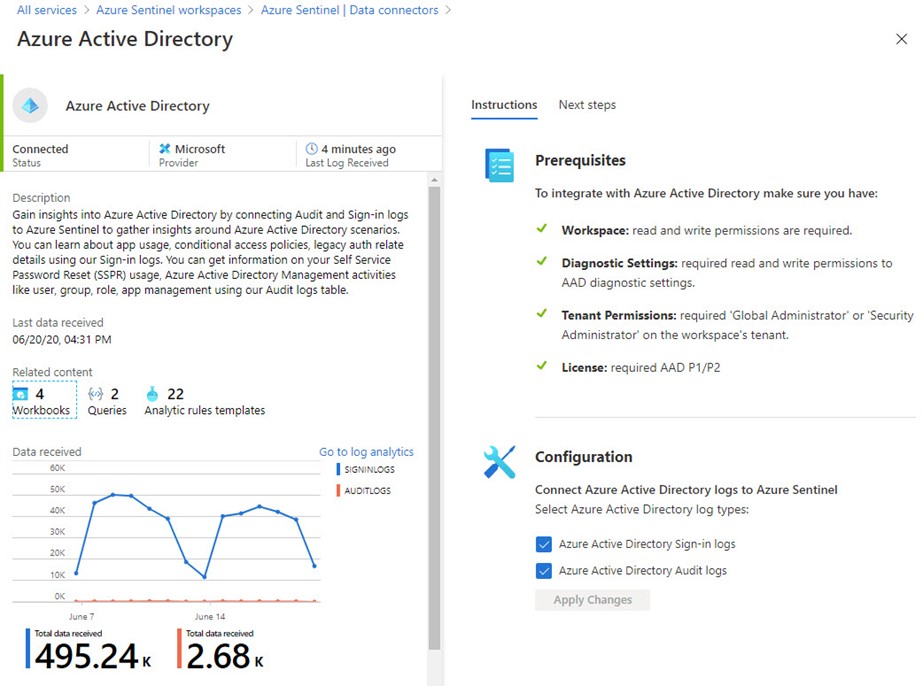 Figure 3 – Connecting Azure Active Directory SSO Sign-in and Audit logs to Azure Sentinel is a simple task if you have the right license and permissions.