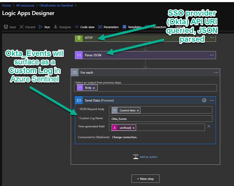 Figure 6 – An Azure Logic App does the work of the Sentinel Playbook OktaEvents-to-Sentinel that scrapes events from Okta using a REST API query to an HTTP URI.