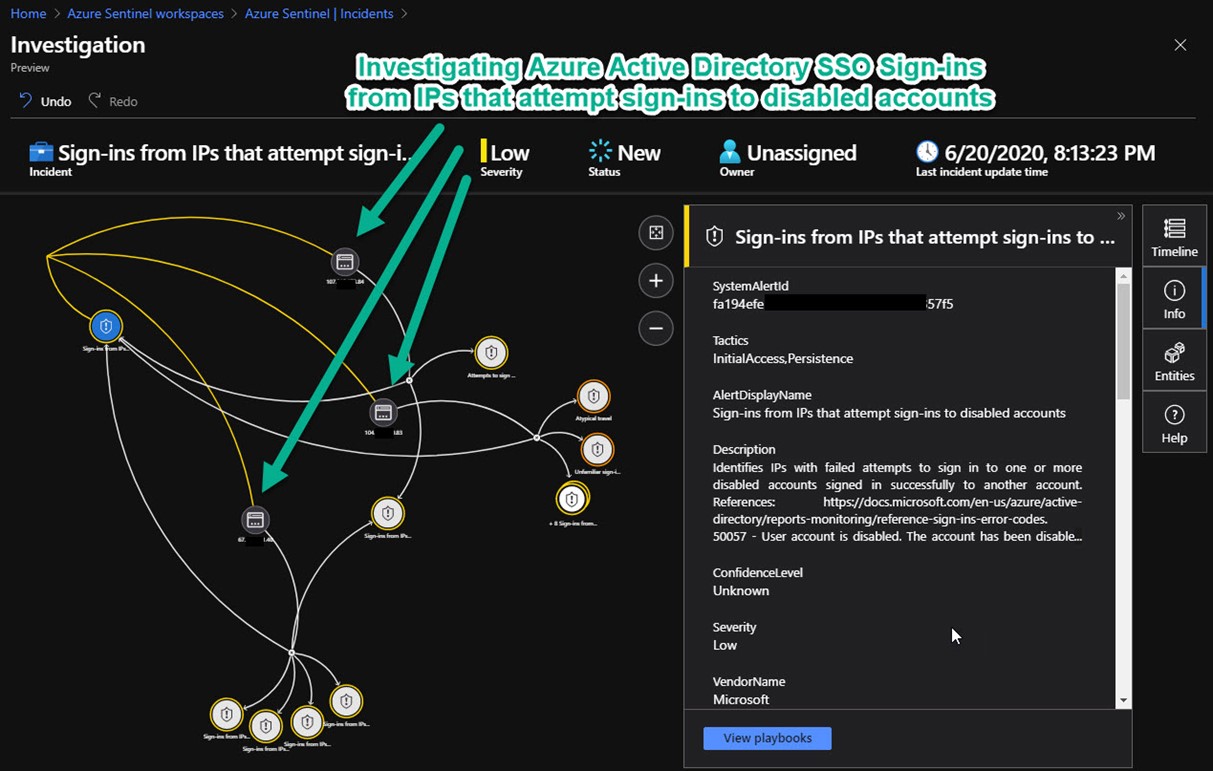 Sample rule walk-thru: When you enable the analytics rule Sign-ins from IPs that attempt sign-ins to disabled accounts, an incident will be created when a non-disabled account signs in successfully from the same IP as the disabled accounts. Investigating such an incident (as shown in Figure 9) leverages the sophisticated features of Azure Sentinel. This is what this is all about—you are augmenting the surveillance of your SSO doorman by analyzing and aggregating otherwise discrete events to detect security situations you want to be aware of.