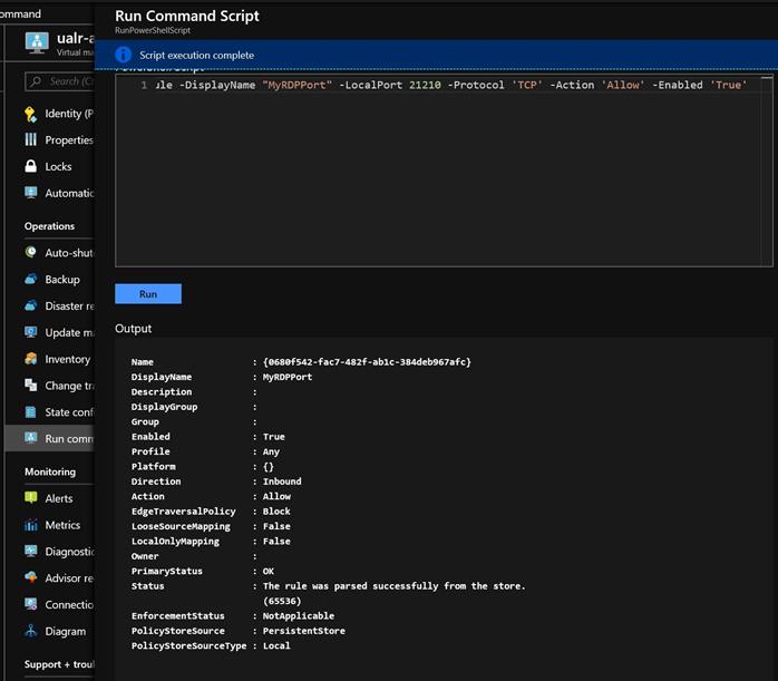 Solution: Use the Run Command Script feature to open the Windows Firewall on TCP port 21210 (an example random high numbered port). Paste this command into script line 1 in the Virtual Machine -> Operations -> Run Command Script and press Run.