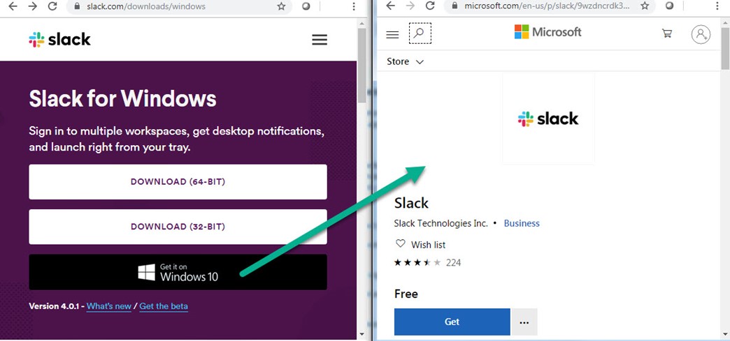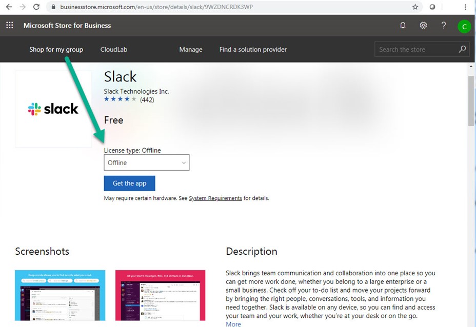 Rather than direct users to vendor software download sites, Windows 10 organizations can direct users to the Microsoft Store where all needed applications are easy to find and in one place. The default public Microsoft Store is an end-user facing experience, that is, it serves individual consumers. Your users can access software titles like Slack directly from the public-facing Microsoft Store by searching for them in the marketplace.