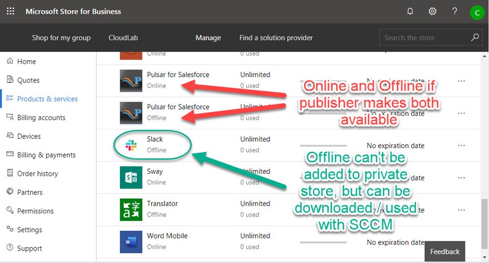 - If the app is also available for Offline License, you can toggle from Online to Offline selection, then pressing the Get the app button again also adds the app to your applications inventory, but in the offline license mode. (These offline apps cannot be added to the private store, but can be downloaded separately or to SCCM.)