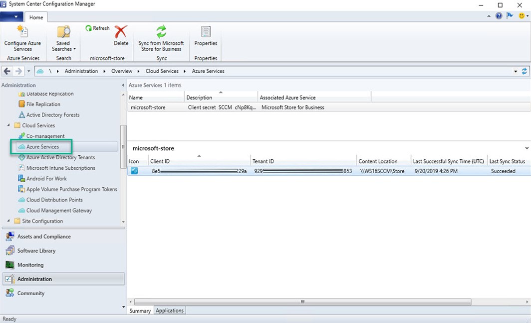 Figure 6 – Configure Azure Services in SCCM to use the Azure AD App registration when synchronizing with the Microsoft Store.
