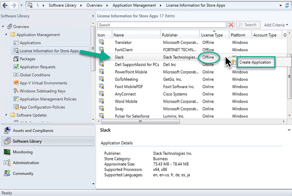 Configure the suite of offline apps you want to deploy in the Microsoft Store portal. Then perform a Sync from Microsoft Store for Business with the Azure service. After a successful sync, in the Software Library area of the SCCM console, the License Information for Store Apps branch will populate with data from the Microsoft Store. Figure 7 shows an offline license for Slack has been acquired and synchronized.