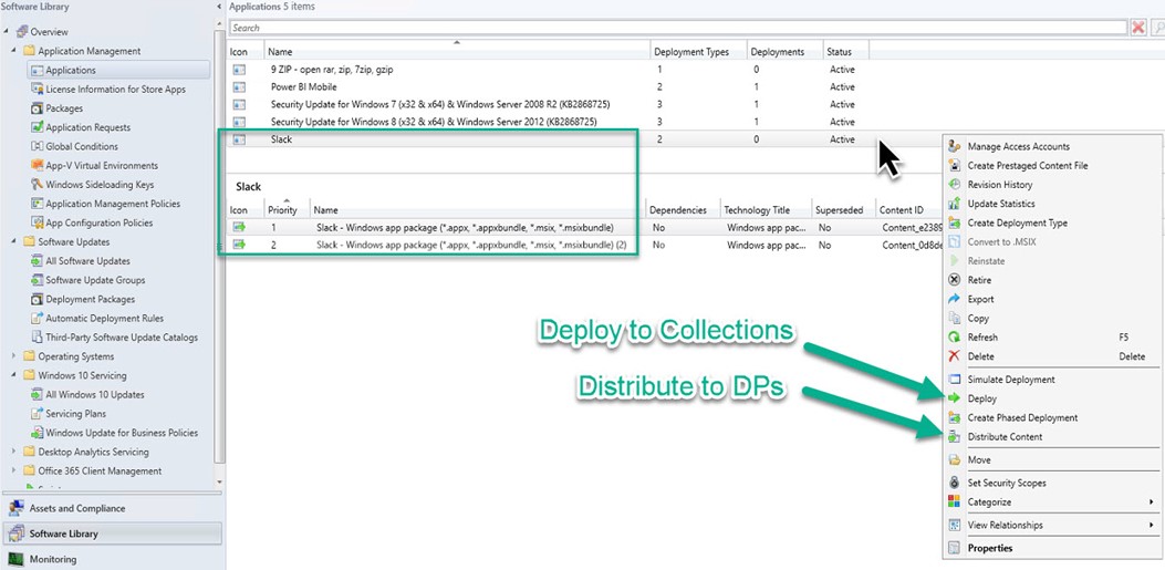 At this point, you will be ready to deploy your downloaded app to SCCM client computers like any conventional software application. Figure 9 shows Slack ready to distribute to Distribution Points (DPs) then deploy to SCCM client computer collections. The client Windows 10 computers do not need Internet connection or permission to connect to the Microsoft Store.